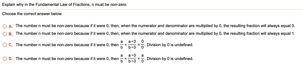 Solved Explain Why In The Fundamental Law Of Fractions Must Be Non Zero Choose The Correct Answer Below The Number Must Be Non Zero Because It Were 0 Then When The Numerator And Denominator